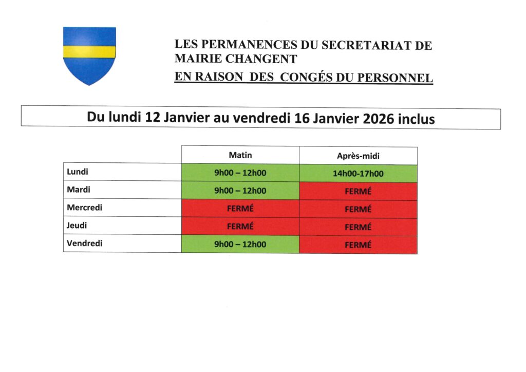 Horaires du secrétariat de mairie du lundi 12 janvier au vendredi 16 janvier 2026